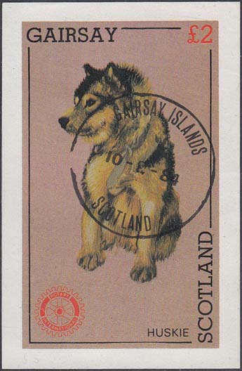 1984 г. Разм. рис. 46 х 79 мм. Многоцветная печать на белой бумаге. В центре на сплошном фоне изображение собаки породы Хаски. По периметру название острова на английском языке и номинал.