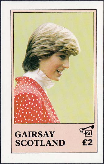 1980(?) г. Разм. рамки 47 х 79 мм. Многоцветная печать на белой глянцевой бумаге. В центре портрет Принцессы Дианы в профиль. Внизу номинал и текст на английском языке.