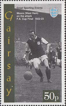 1980(?) г. Разм. рис. 33 х 57 мм. Многоцветная печать на белой бумаге. Зубц. 14 1/2. С клеем. В центре различные футбольные сюжеты, символика клубов и тексты на английском языке.