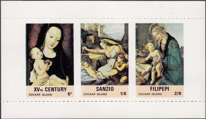 1980(?) г. Блок. Разм. 136 х 73 мм. Многоцветная печать на белой бумаге. В центре различные картины. Горизонтальная просечка. С клеем.