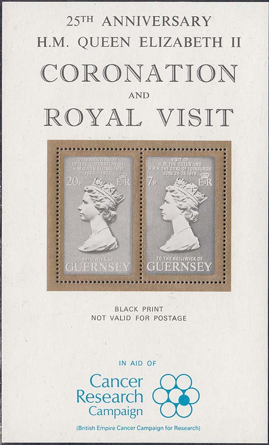 1977 г. Листок разм. 89 х 147 мм. Многоцветная печать на белой бумаге. 14 1/2. С клеем. В центре а в декоративной рамке портрет Елизаветы II в профиль. Тексты на английском языке.