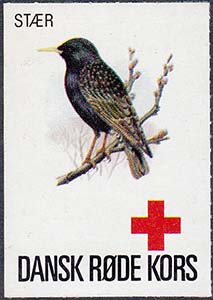 1980(?) г. Разм. 35 х 50 мм. Многоцветная печать на белой бумаге. Линейная просечка. С клеем. В центре птицы различных видов. Внизу знак красного креста и текст на датском языке: "Датский Красный Крест"