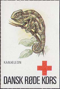 1980(?) г. Разм. 36 х 51 мм. Многоцветная печать на белой глянцевой бумаге. Линейная просечка. В центре различные рептилии. Внизу знак Красного Креста и текст на датском языке: "Датский Красный Крест".