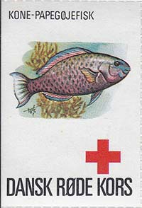 1980(?) г. Разм. 35 х 50 мм. Многоцветная печать на белой бумаге. Линейная просечка. С клеем. В центре рыбы различных видов. Внизу знак красного креста и текст на датском языке: "Датский Красный Крест".