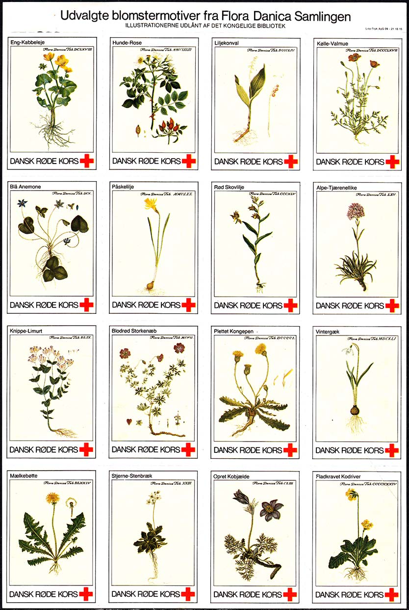1980(?) г. Разм. 31 х 46 мм. Многоцветная печать на белой бумаге. Линейная просечка. С клеем. В центре растения различных видов. Внизу знак красного креста и текст на датском языке: "Датский Красный Крест".