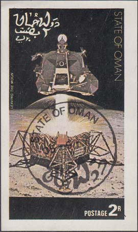 1977 г. Разм. 45 х 76 мм. Многоцветная печать на белой глянцевой бумаге. В центре взлетающий с луны Лунный модуль. Название страны на английском и арабском языках. Справа внизу номинал.