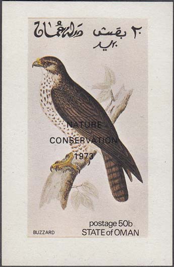 1973 г. Разм. рис. 45 х 26 мм. Многоцветная печать на белой глянцевой бумаге. Зубц. 14. В центре на сплошном фоне изображения птиц различных видов. По периметру пояснительная подпись, название территории на английском и арабском языках и номинал.