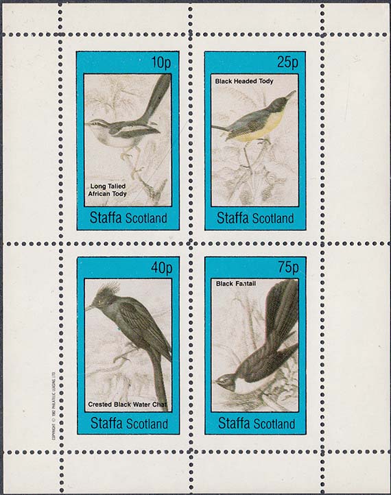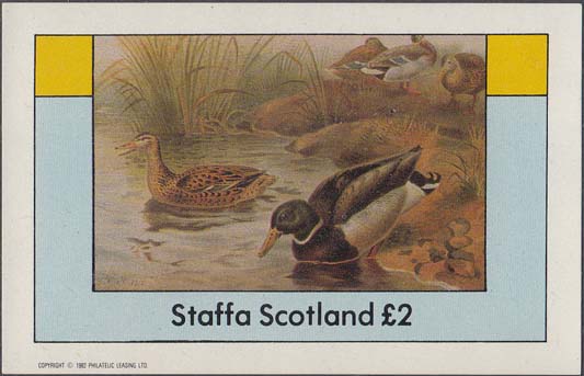 1982 г. Разм. 25 х 44 мм. Многоцветная печать на белой глянцевой бумаге. В центре в прямоугольной рамке птицы различных видов и пояснительный текст на английском языке. В правом верхнем углу номинал. Внизу текст на английском языке: "Staffa Scotland".