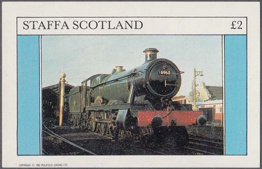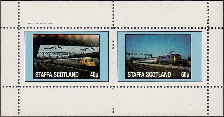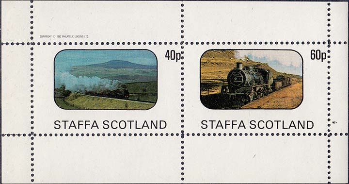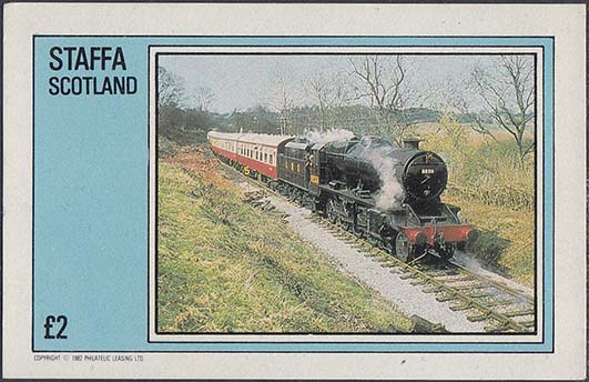 1982 г. Разм. 90 х 58 мм. Многоцветная печать на белой глянцевой бумаге. С клеем. В центре паровоз. Слева текст на английском языке: "Staffa Scotland" и номинал.