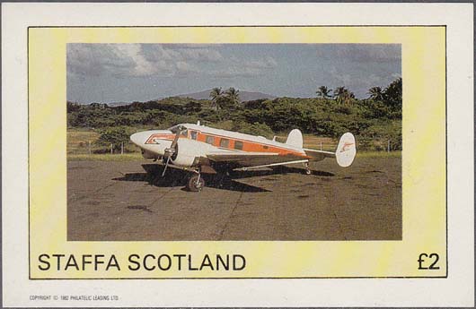 1982 г. Разм. 91 х 57 мм. Многоцветная печать на белой бумаге. С клеем. В центре в прямоугольной рамке самолет на аэродроме на фоне гор. Внизу текст на английском языке: "Staffa Scotland" и номинал.