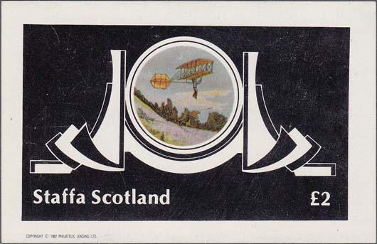 1982 г. Разм. 89 х 57 мм. Многоцветная печать на белой бумаге. С клеем. В центре на сплошном фоне в декоративной рамке самолет-биплан, летяший с горы. Внизу текст на английском языке: "Staffa Scotland" и номинал.