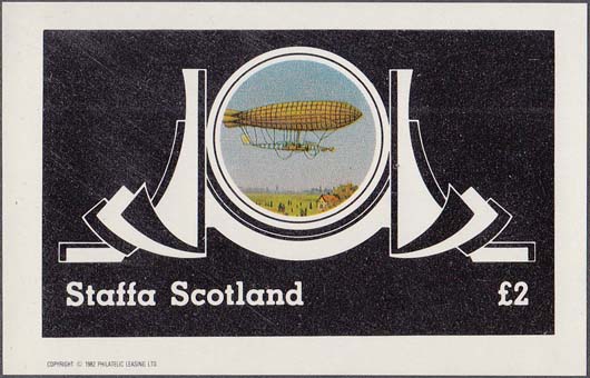1982 г. Разм. 78 х 46 мм. Многоцветная печать на белой бумаге. С клеем. В центре на сплошном фоне в декоративной рамке дирижабль в полете. Внизу текст на английском языке: "Staffa Scotland" и номинал.