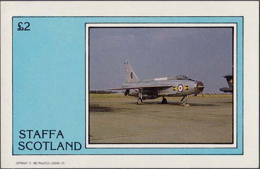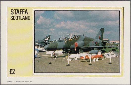 1982 г. Разм. 91 х 57 мм. Многоцветная печать на белой бумаге. С клеем. В центре в прямоугольной рамке реактивный самолет. Внизу текст на английском языке: "Staffa Scotland" и номинал.