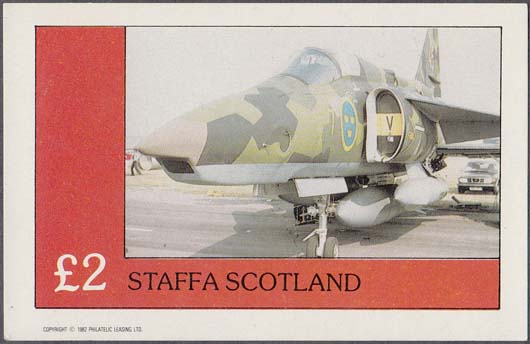 1982 г. Разм. 91 х 57 мм. Многоцветная печать на белой бумаге. С клеем. В центре в прямоугольной рамке самолет на палубе авианосца. Внизу текст на английском языке: "Staffa Scotland" и номинал.