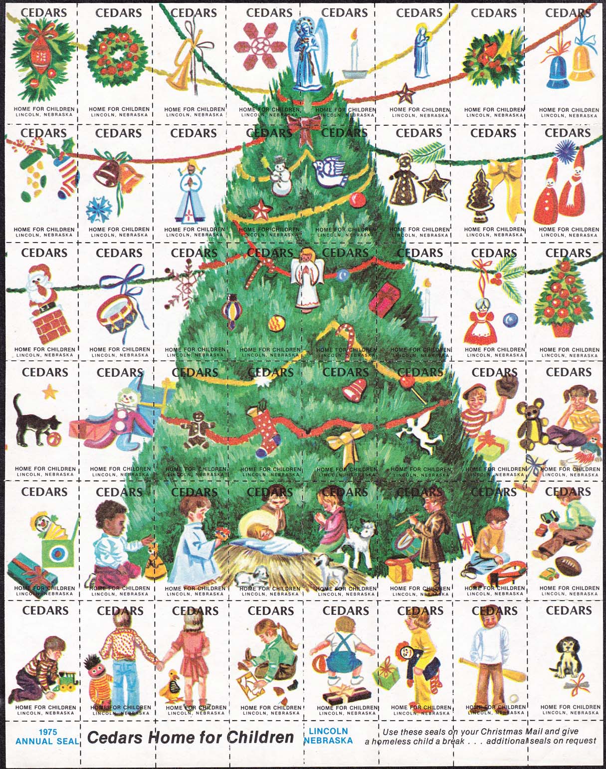 1975 г. Многоцветная печать на белой бумаге. Линейная просечка. С клеем. В центре различные рисунки. Текст на английском языке в три строки: "CSDARS приют для детей Линкольн, Небраска".
