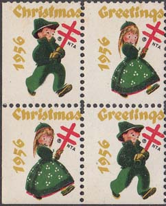 1956 г. Разм. по перфорации 21 х 26 мм. Многоцветная печать на белой бумаге. Зубц. 12 3/3. С клеем. В центре изображение детей с лотарингским крестом в руках. По периметру дата: "1956" и текст на английском языке: "Рождество".