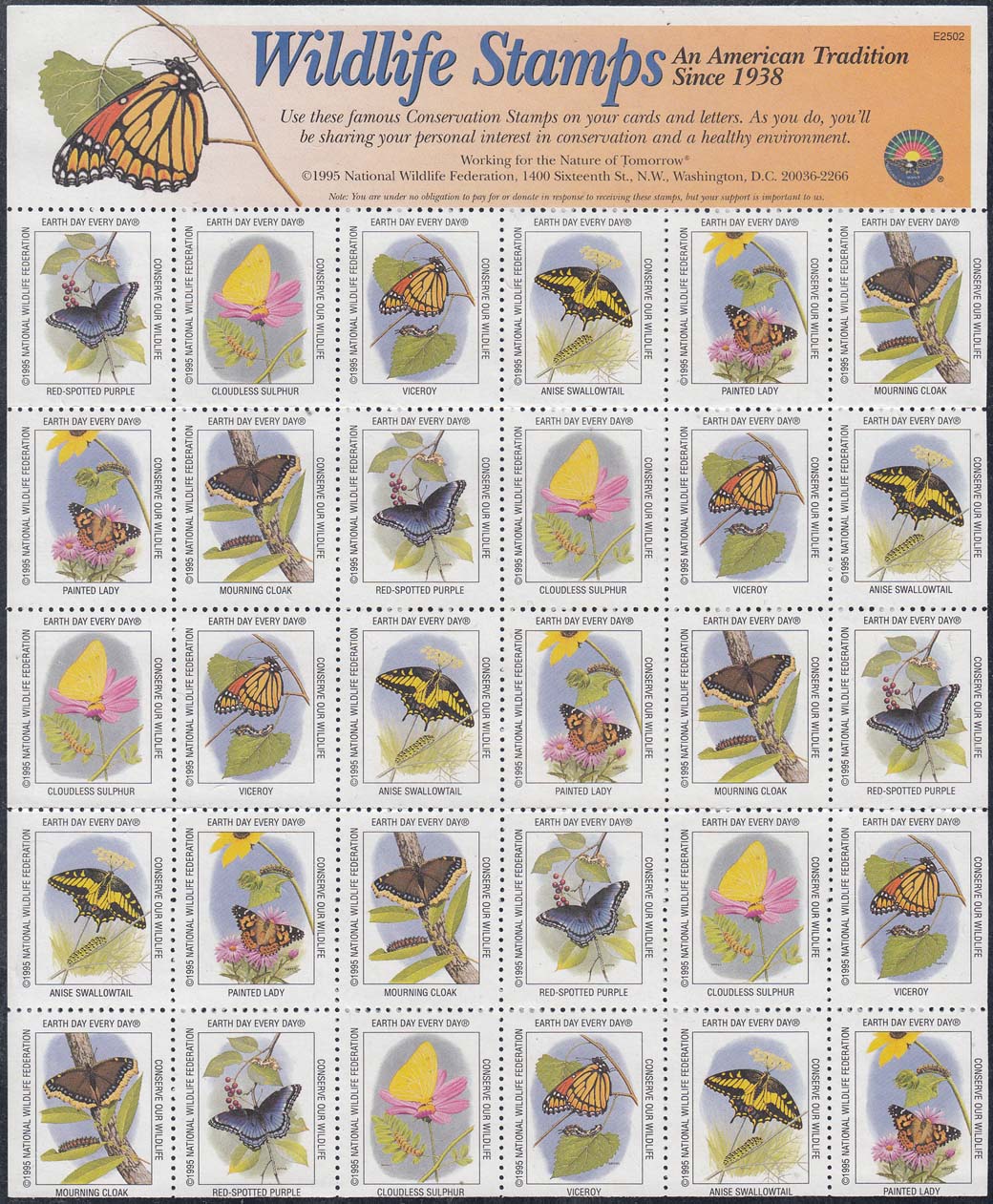 1995 г. Разм. рамки 21 х 27 мм. Многоцветная печать на белой глянцевой бумаге. Зубц. 11. С клеем. В центре изображения бабочек различных видов. По внешнем периметру рамки тексты на английском языке.