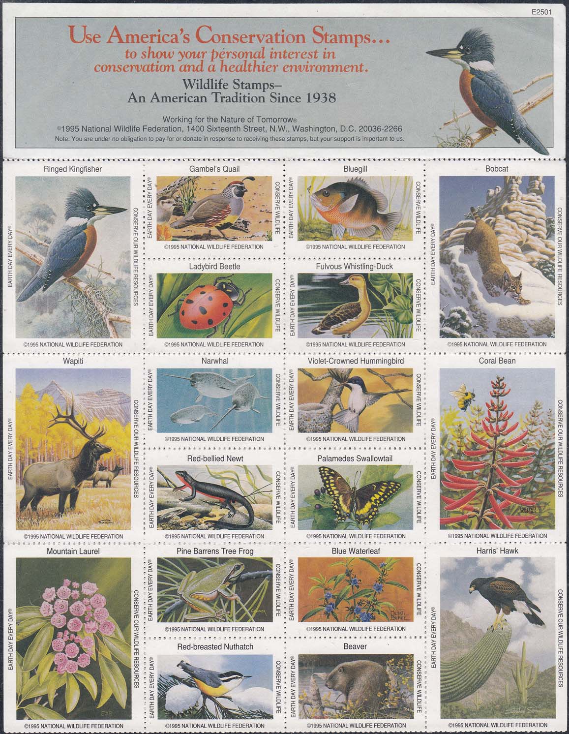 1995 г. Разм. рис. 40 х 22 и 40 х 55 мм. Многоцветная печать на белой глянцевой бумаге. Зубц. 11 1/2. С клеем. В центре изображения животных различных видов. По внешнем периметру рамки тексты на английском языке.