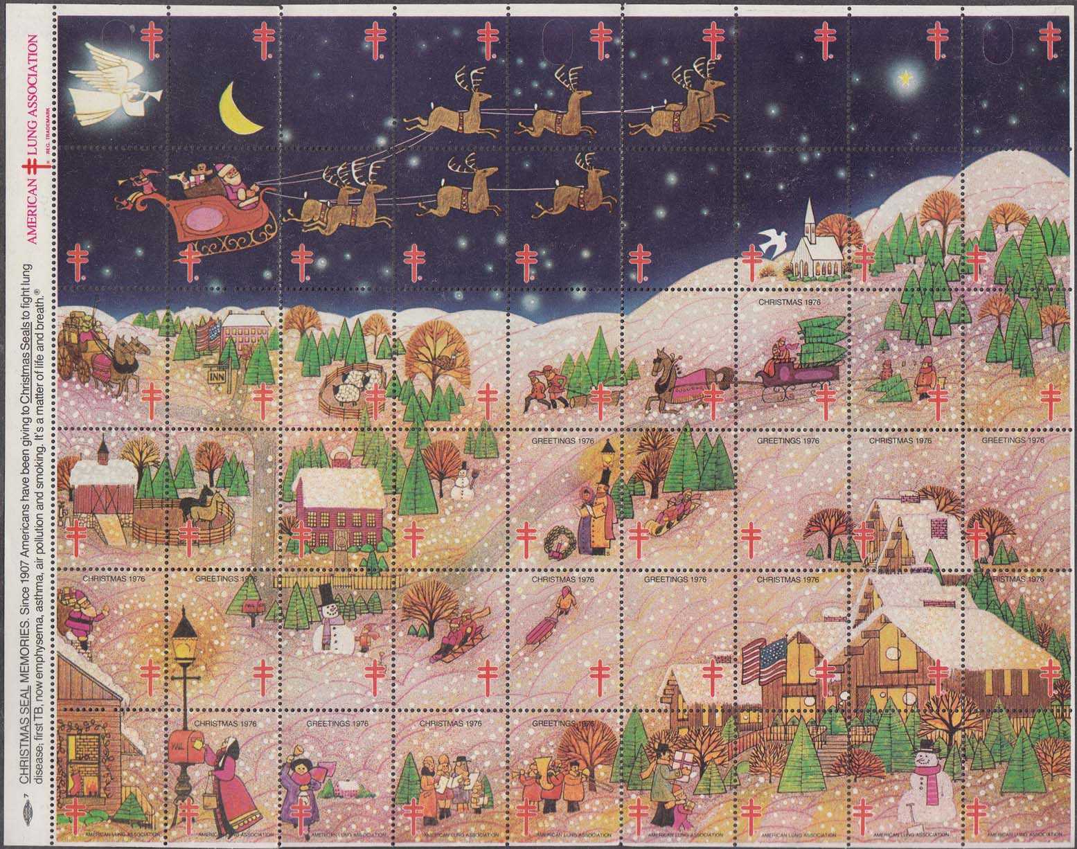 1976 г. Разм. по перфорации 28 х 34 мм. Многоцветная печать на белой глянцевой бумаге. зубц. 13. С клеем. Различные рождественские сюжеты, лотарингский крест и текст на английском языке: "Рождество 1976. Американская ассоциация пульманологов".