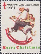 1981 г. Разм. по перфорации 28 х 34 мм. Многоцветная печать на белой бумаге. зубц. 12 3/4. С клеем. В центре мужчина и мальчик на коне-качалке. Сверху лотарингский крест и текст на английском языке: "Американская ассоциация пульманологов 1981". Внизу тест на английском языке: "C Рождеством".