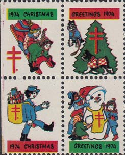 1974 г. Разм. по перфорации 20 х 25 мм. Многоцветная печать на белой бумаге. Зубц. 12 3/4. С клеем. В центре различные рождественские сюжеты, лотарингский крест и тексты на английском языке.