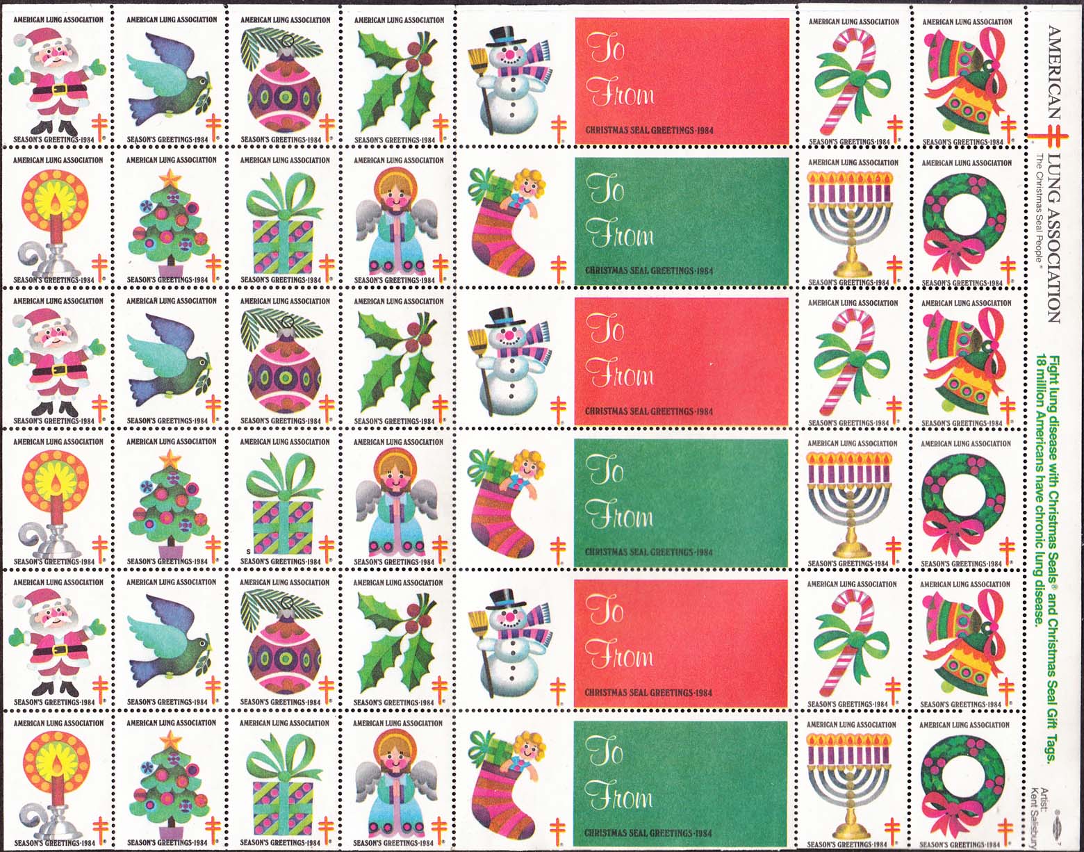1984 г. Разм. по перфорации 28 х 34 мм и 83 х 34 мм. Многоцветная печать на белой бумаге. Зубц. 11 1/2. С клеем. В центре различные рождественские сюжеты, лотарингский крест и тексты на английском языке.