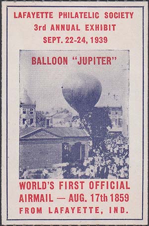 1939 г. Разм. рамки 46 х 51 мм. В центре воздушный шар над городом. тексты на английском языке.
