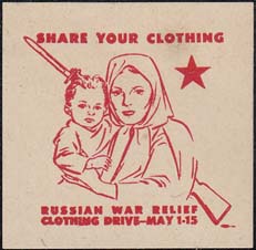 1941(?) г. Разм. 39 х 38 мм. Одноцветная печать на белой бумаге. С клеем. Женщина с ребенком на форе винтовки и пятиконечной звезды. Сверху текст на английском языке: "Поделись своей одеждой". Внизу текст в две строки на английском языке: "Общество помощи России в войне. Прием одежды - Май 1-15".