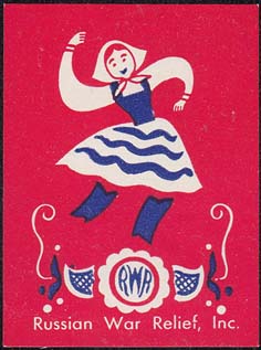 1941(?) г. Разм. 39 х 53 мм. Двухцветная печать на белой бумаге. С клеем. В центре стилизованное изображение танцующей женщины. Внизу декоративные элементы, аббревиатура на английском языке "RWR" и текст на английском языке: "Общество помощи России в войне".