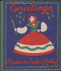 1941(?) г. Разм. рамки 41 х 49 мм. Многоцветная печать на белой бумаге. С клеем. В центре в декоративной рамке изображение женщины в национальном костюме. Сверху текст на английском языке: "С рождеством!". Внизу текст на английском языке: "Общество помощи России в войне".