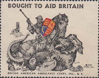 1941 г. Разм. по перфорации 58 х 75 мм. Многоцветная печать на белой бумаге. Зубц. 11 3/4. С клеем(?). В центре аллегорический рисунок: Английский рыцарь на коне поражает копьем дракона со свастикой. Тексты на английском языке.
