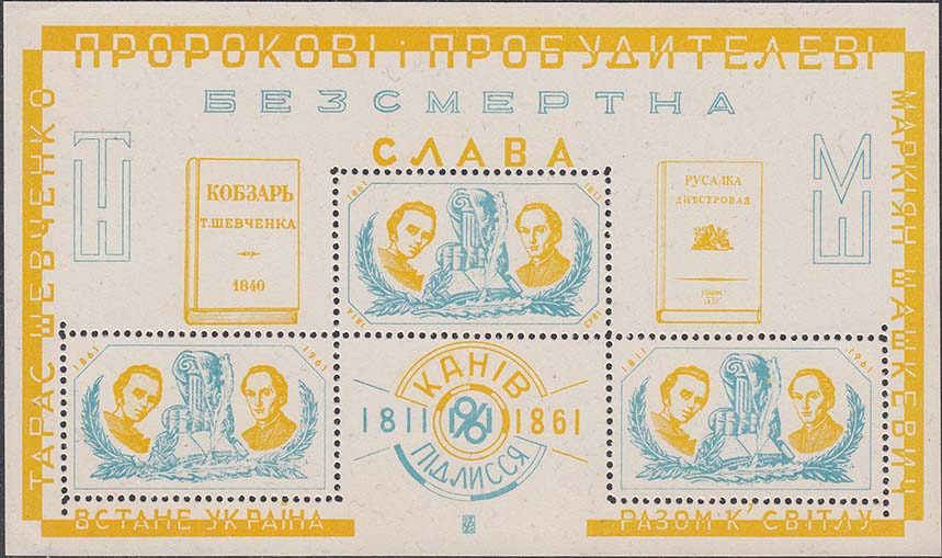 1961 г. 06.11.1961 г. Разм. 145 х 85 мм. Двухцветная печать на белой глянцевой бумаге. Зубц. 12. С клеем. В центре три виньетки с портретами Тараса Шевченко и Маркиана Шашкевича. Тексты на украинском языке.