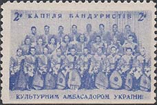 1957 г. 02.12.1957 г. Разм. рис. 34 х 23 мм. Одноцветная печать на белой бумаге. Зубц. 12 1/2. С клеем. В центре репродукция фотографии капеллы бандуристов. В верхних углах номинал. Текст в две строки на украинском языке: "Капелла бандуристов - культурный посол Украины".