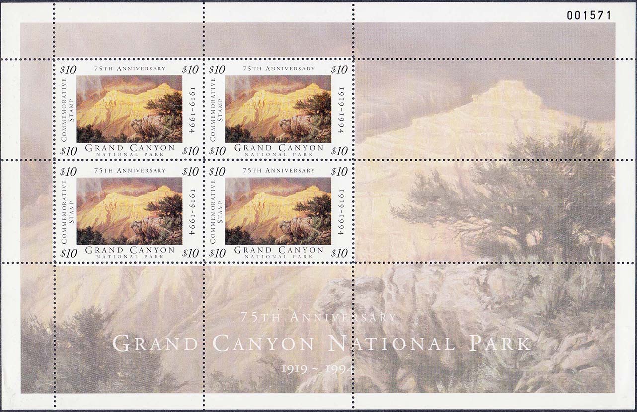 1994 г. 75 лет национального парка Большой Каньон. Разм. по перфорации 51 х 35 мм. Многоцветная печать на белой глянцевой бумаге. Зубц. лин. 12 1/2. С клеем. В цен ре фоторгафия Большого Каньона. Про углам номинал. По внешнему периметру рисунка тект на английском языке: "Памятная марка. 75 лет национального парка Большой Каньон".