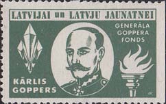 1961 г. Разм. рисунка 24 х 35 мм. Одноцветная печать на белой бумаге. Зубц. 12 1/2. С клеем. В центре в круглой декоративной рамке портрет К. Гоппера. На ленте подпись к портрету на латышском языке и даты жизни: "1876 - 1941".