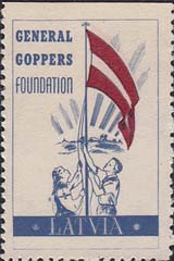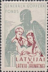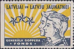 1964 г. Разм. 23 х 36 мм. Двухцветная печать на белой бумаге. Зубц. 12 1/2. С клеем. В прямоугоьной рамке в центре юноша и девушка поднимают флаг Латвии. Название организации на латышском или английском языках.