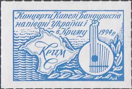 1994 г. Разм. рамки 36,5 х 23,5 мм. Одноцветная печать на белой мелованной бумаге. Линейная просечка. В прямоугольной рамке в центре карта Крым, бандура и лавровые ветви. Сверху текст в три строки на украинском языке: "Концерт Капеллы Бандуристов на юге Украины и в Крыму. 1994 г."