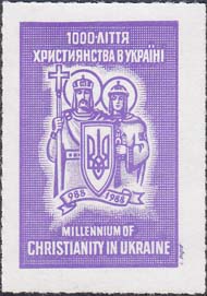 1988 г. Разм. рис. 24 х 38 мм. Одноцветная печать на белой мелованной бумаге. Линейная просечка. С клеем. В центре на сплошном сетчатом фоне Св. Владимир и Св. Ольга. Текст на украинском и английском языках: "1000-летие Христианства на Украине".