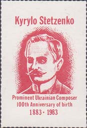 1983 г. Разм. по просечке 30 х 44 мм. Одноцветная печать на белой глянцевой бумаге. Линейная просечка. В центре портрет К. Стеценко. Текст на английском языке.