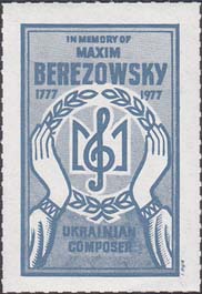 1980(?) г. Разм. 24 х 38 мм. Одноцветная печать на белой мелованной бумаге. Линейная просечка. С клеем. В центре трезубец и скрипичный ключ в обрамлении венка. Текст на английском языке: "Памяти Максима Березовского 1777 1977 украинского композитора".