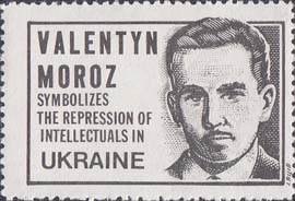 1980(?) г. Разм. 39,5 х 25 мм. Одноцветная печать на белой глянцевой бумаге. Зубц. 12 1/2. С ко=леем. В прямоугольной рамке справа портрет В. Мороза. Слева текст в шесть строк на английском языке: "Валентин Мороз символизирует репрессии против интеллигенции на Украине".