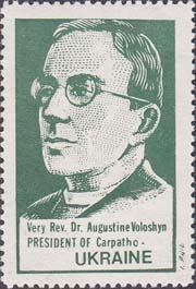 1980(?) г. Разм. рамки 24,5 х 39,5 мм. Одноцветная печать на белой глянцевой бумаге. Зубц. 12 1/2. С клеем. В центре портрет А. Волошина. Внизу текст в три строки на английском языке: "Августин Волошин - президент Карпатской Украины".