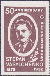 1982(?) г. Разм. 24 х 37 мм. Одноцветная печать на белой глянцевой бумаге. Линейная просечка. С клеем. В центре портрет И. Васильченко. По периметру текст на английском языке: "50 летие со дня смерти украинского писателя Степана Васильченко."