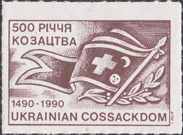 1990 г. Разм. рамки 40 х 26 мм. В прямоугольной рамке в центре знамена. А левом верхнем углу текст в две строки на украинском языке: "500 лет казачеству". Слева внизу текст в две строки на английском языке: "1490 - 1990 украинское казачество".