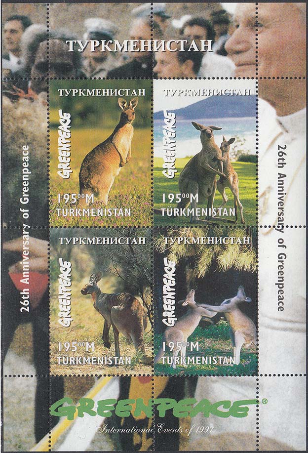 1997(?) г. Разм. рис. 36 х 51 мм. Многоцветная ечать на белой бумаге. Зубц. 13 1/2. С клеем. В центре различные фотографии кенгуру в природе. Текст на русском и английском языках: "Туркменистан", номинал и текст на английском языке: "Greenpeace".