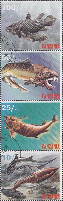 1998 г. Разм. по перфорации 45 х 36 мм. В центре реликтовые рыбы различных видов, название страны на английском языке и номинал.