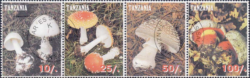 1998 г. Разм. по перфорации 45 х 36 мм. В центре грибы различных видов, название страны на английском языке и номинал.
