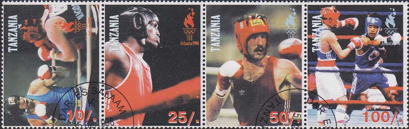 1998 г. Разм. по перфорации 45 х 36 мм. В центре репродукции фотографий соревнований по боксу, название страны на английском языке и номинал.