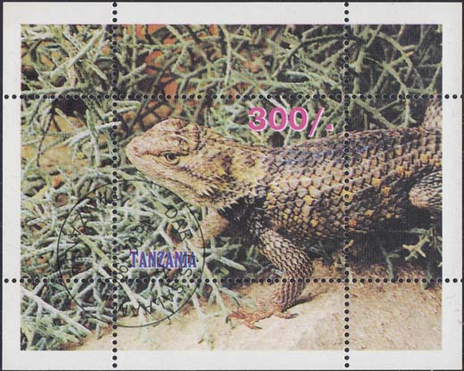 1998 г. Блок разм. 88 х 70 мм. Многоцветная печать на белой глянцевой бумаге. Зубц. 13 3/4. В центре на марке игуана на фоне природы. В правом верхнем углу номинал. В левом нижнем углу название территории на английском языке: "Танзания". На полях блока продолжение рисунка.