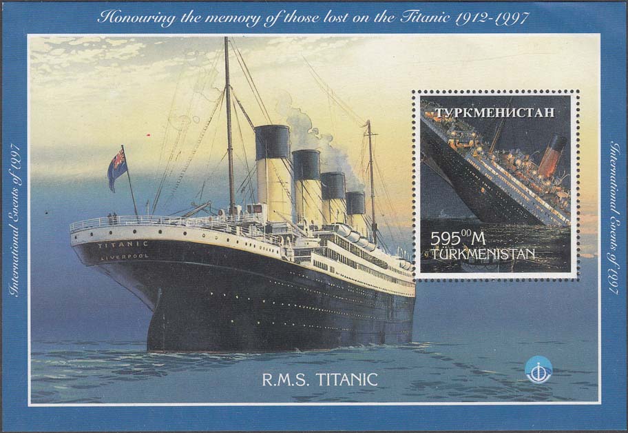 1997 г. Блок разм. 154 х 105 мм. Многоцветная печать на белой глянцевой бумаге. Зубц. рам. 13 1/4. На марке в центре тонущий Титаник. Название страны на русском и английском языках и номинал. На полях плывущий Титаник и тексты на английском языке.